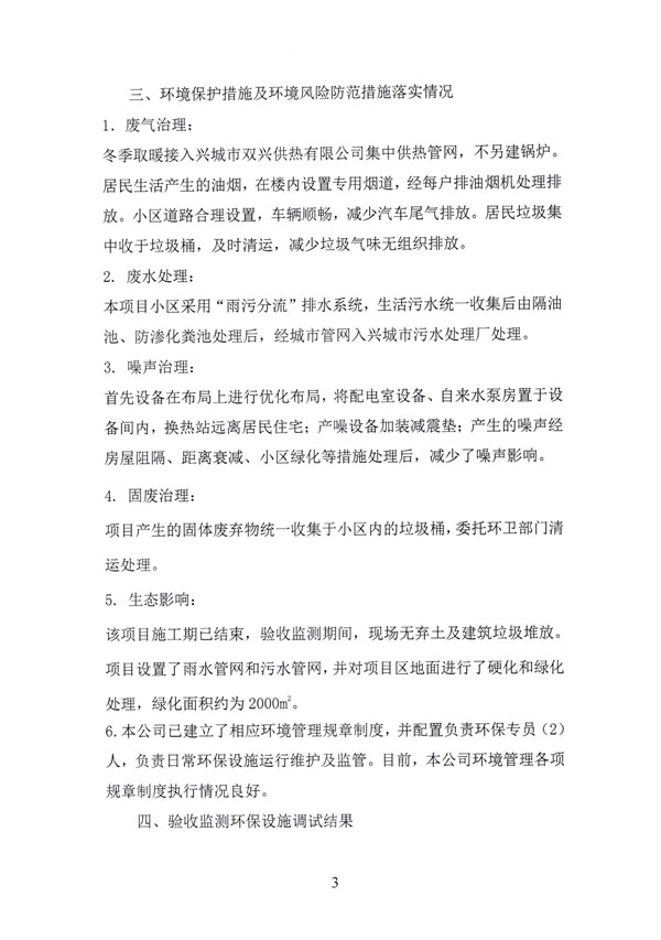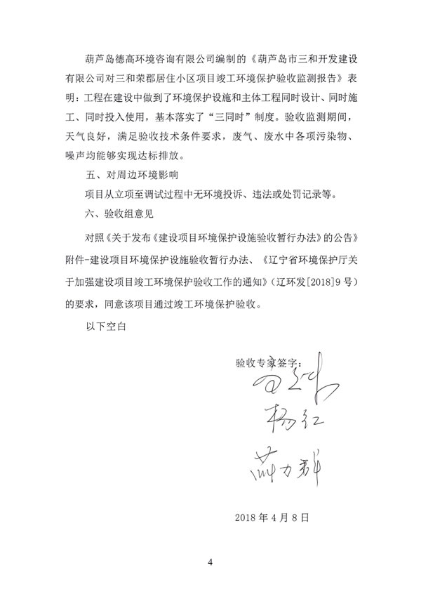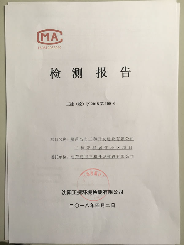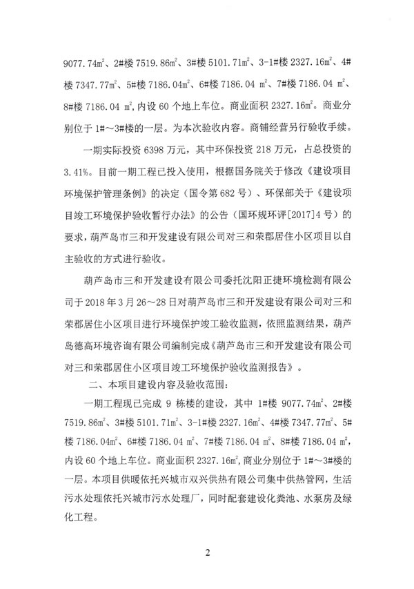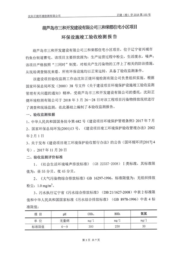 。14)沈陽正捷環(huán)境檢測有限公司《葫蘆島市三和開發(fā)建設有限公司三和榮郡居住小區(qū)項目環(huán)保設施竣工驗收檢測報告》,2018年4月2日。