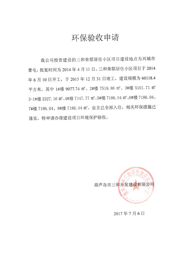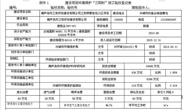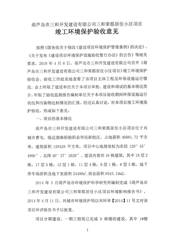 該項目根據(jù)《中華人民共和國環(huán)境保護法》和《建設項目環(huán)境保護管理辦法》的規(guī)定進行了環(huán)境影響評價。 2014年3月葫蘆島市環(huán)境保護科學研究所編制完成《葫蘆島市三和開發(fā)建設有限公司三和榮郡居住小區(qū)項目環(huán)境影響報告表》,2014年4月11日興城市環(huán)境保護局以興環(huán)審【2014】11號文給與《關于葫蘆島市三和開發(fā)建設有限公司三和榮郡居住小區(qū)項目環(huán)境影響報告表的批復》,該項目環(huán)境保護檔案資料齊全。