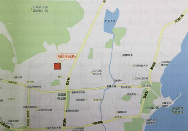 項目位于興城市曹屯,臨近渤海船舶職業(yè)學院新校區(qū),中心坐標為東經(jīng)120°45′4996″、北緯40°37′2628″。具體位置見圖3-1。