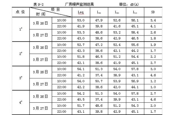 監(jiān)測結果:廠界四周晝、夜間噪聲監(jiān)測值均達到《社會生活環(huán)境噪聲排放標準》(GB22337-2008)1類區(qū)標準標準,屬達標排放。