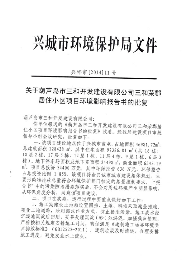 。13)興城市環(huán)境保護局 興環(huán)審【2014】11號文《關于葫蘆島市三和開發(fā)建設有限公司三和榮郡居住小區(qū)項目環(huán)境影響報告表的批復》,2014年4月11日;