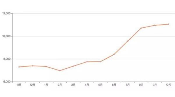 在多種因素的作用下,貴陽(yáng)房?jī)r(jià)開啟狂奔模式。吉屋網(wǎng)的數(shù)據(jù)顯示,2018年10月,貴陽(yáng)的新房均價(jià)為11172元/平方米,而去年同期僅為7377元/平方米,一年時(shí)間內(nèi)漲幅超過(guò)50%。