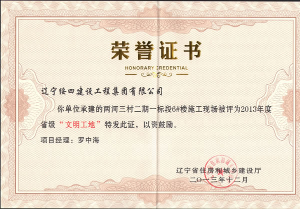 2013年12月由羅忠海項目部承建的兩河三村二期一標段6#樓施工現(xiàn)場被遼寧省住房和城鄉(xiāng)建設廳評為2013年度省級“文明工地”。