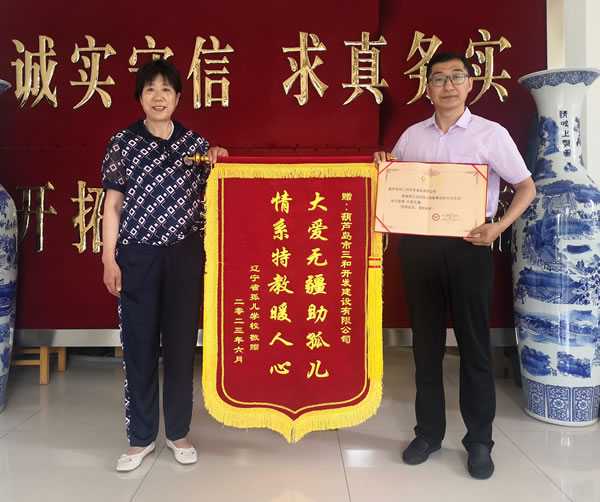 2023年6月,葫蘆島市三和開發(fā)建設有限公司捐贈十萬元給遼寧省孤兒學校,用于支持孤兒特教事業(yè)、改善孩子們的生活條件。