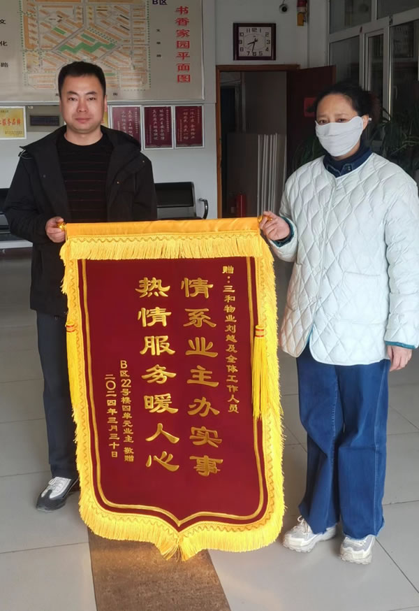 近日,書香家園B區(qū)一業(yè)主親手將一面繡有“情系業(yè)主辦實(shí)事 熱情服務(wù)暖人心”的錦旗贈(zèng)送給三和物業(yè)團(tuán)隊(duì),以表達(dá)對(duì)他們?cè)谔幚硐滤蓝氯麊?wèn)題上所展現(xiàn)出的高效服務(wù)和專業(yè)務(wù)實(shí)態(tài)度的高度贊揚(yáng)與深深感謝。