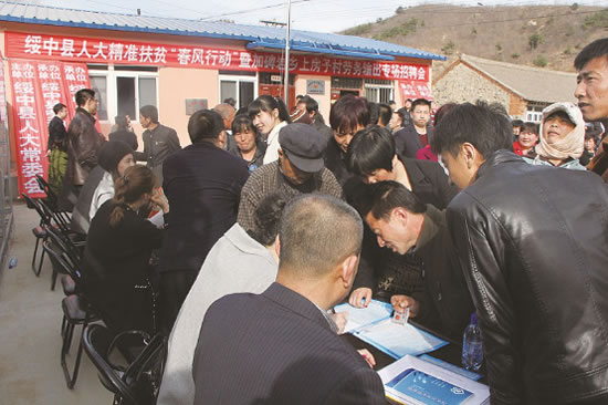 2016年3月22日,我公司參加了由縣人大主辦,縣勞動(dòng)和社會(huì)保障局、加碑巖鄉(xiāng)政府、扶貧辦、新聞中心承辦的“綏中縣人大精準(zhǔn)扶貧春風(fēng)行動(dòng)暨加碑巖鄉(xiāng)上房子村勞務(wù)輸出專場(chǎng)招聘會(huì)”。 縣委書記、東戴河新區(qū)黨工委書記劉旭東參加并作講話?h人大常委會(huì)主任王躍明宣布招聘活動(dòng)開始?h委副書記王興華,縣委常委、紀(jì)委書記項(xiàng)繼飛,縣人大常委會(huì)副主任杜鐵耕、郭勇,副縣長袁伶,縣長助理邱玉峰及相關(guān)部門負(fù)責(zé)人參加招聘會(huì)開幕式,上房子村及周邊6個(gè)村屯上千人參加了招聘活動(dòng)。