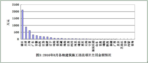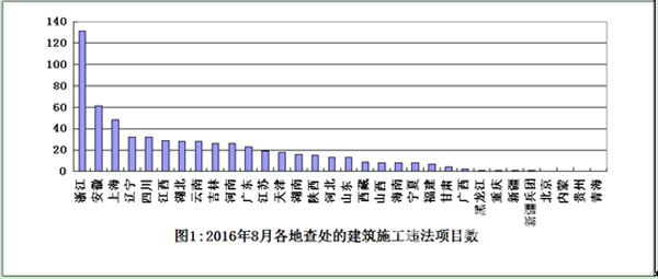 各地查處工作情況。從各地查處的違法工程項目數(shù)量看,浙江、安徽、上海3省(市)查處力度較大,分別查處項目131個、61個、48個(見圖1)。