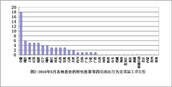 從查處的轉(zhuǎn)包、掛靠等四類違法行為看,安徽、湖北省查處項目相對較多(見圖2)。