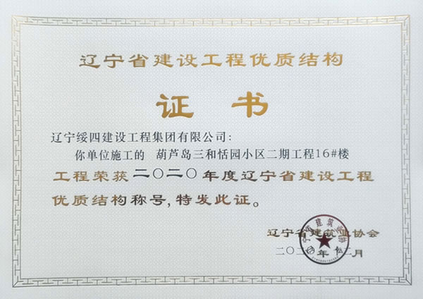 “葫蘆島三和恬園小區(qū)二期工程16#樓”榮獲2020年度遼寧省建設(shè)工程優(yōu)質(zhì)結(jié)構(gòu)稱(chēng)號(hào)