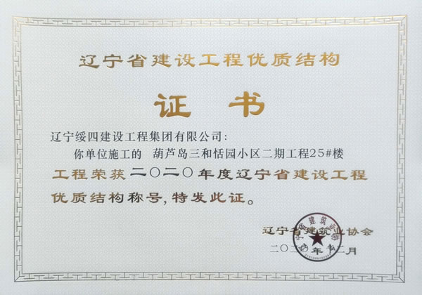 “葫蘆島三和恬園小區(qū)二期工程25#樓”榮獲2020年度遼寧省建設工程優(yōu)質(zhì)結(jié)構(gòu)稱號